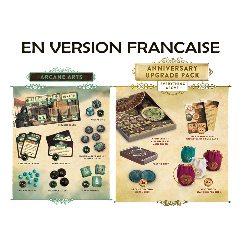 Une boite contenant la nouvelle extension Arts Arcaniques et son traz + 4 sacs pochette de rangement + le plateau alternatif anniversaire + les jetons drachma en métal